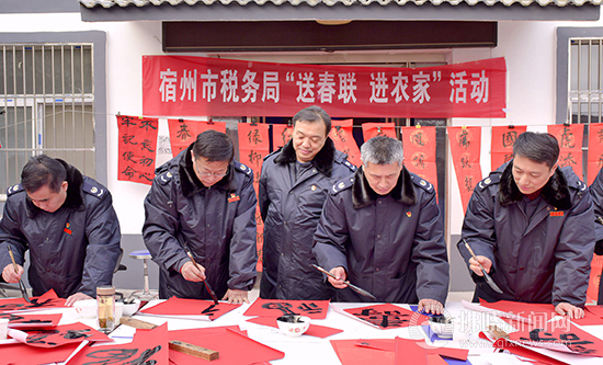 揮毫潑墨送祝福,翰墨飄香迎新春。1月19日下午,市稅務(wù)局黨員志愿者來到幫扶村——碭山縣良梨鎮(zhèn)豐棉村,舉辦“送春聯(lián)、進(jìn)農(nóng)家”活動,為村民送去新春祝福。 沈道光 攝