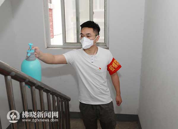 黨員志愿者定期對(duì)小區(qū)樓道及公共區(qū)域進(jìn)行消殺。吳天元 攝