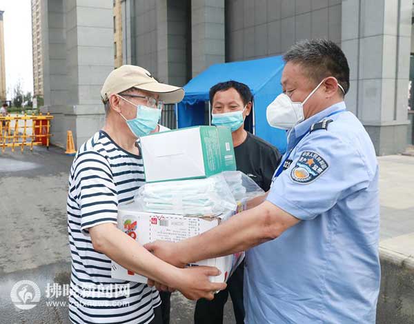 泗縣房管部門的工作人員向小區(qū)疫情防控志愿者贈(zèng)送防疫物資。吳天元 攝