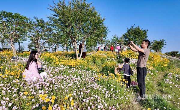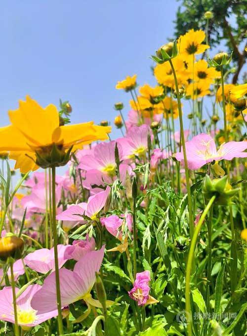 日前,市民在位于宿城新汴河北堤路的宿州中華珍奇紫薇文化園里賞花。初夏時節,紫薇園里的月見草、金雞菊等各色花卉競相綻放,形成一片花的海洋,吸引眾多市民前往拍照打卡。 記者 馬峰 攝