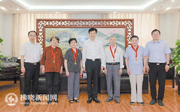 6月28日上午,市委書記楊軍等領(lǐng)導(dǎo)為4名老黨員頒發(fā)“光榮在黨50年”紀念章并合影。記者 董虎 攝