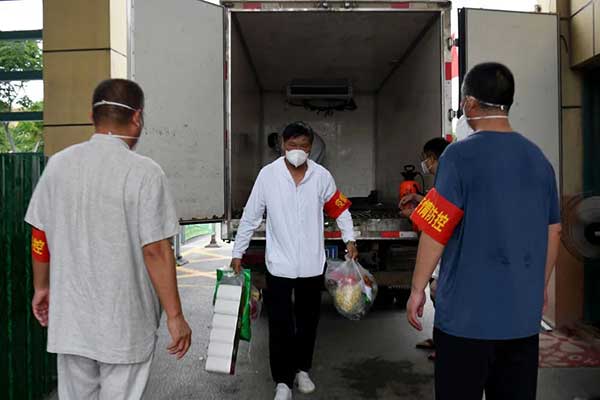 7月4日,安徽泗縣玉蘭小區的工作人員接收居民的訂單物資。新華社記者 黃博涵 攝