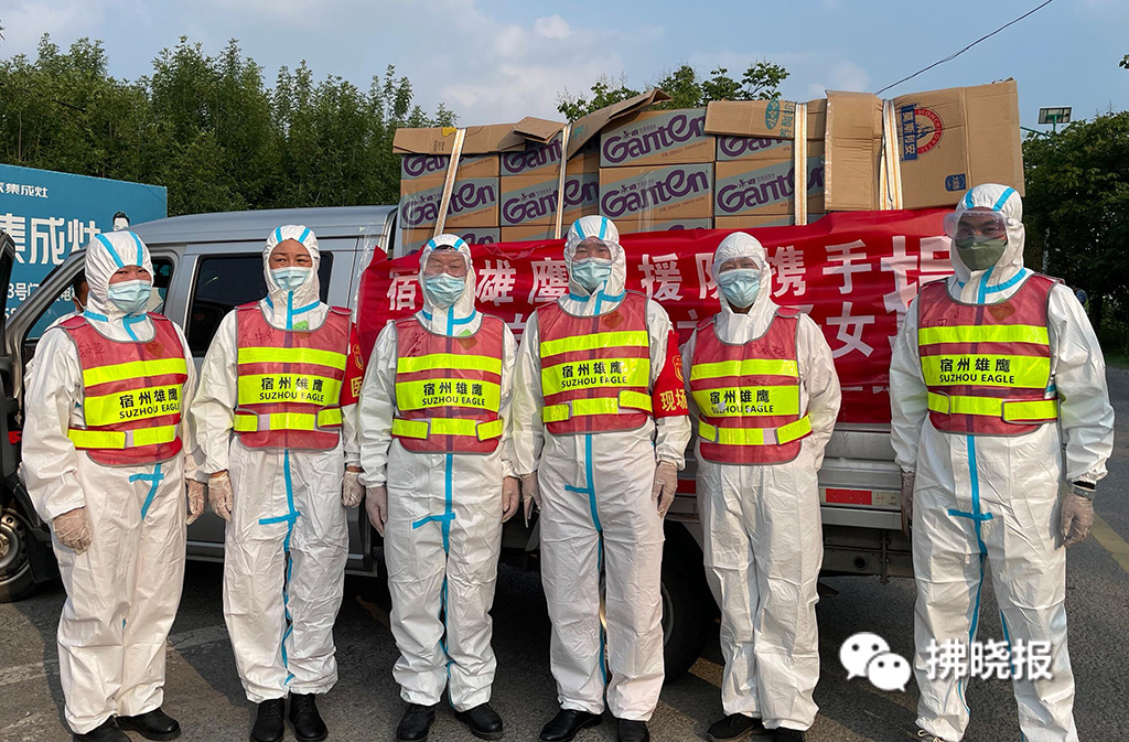 7月8日下午,宿州雄鷹救援隊組織志愿者,把籌集到的愛心物資裝車,并運往靈璧縣支援抗疫。