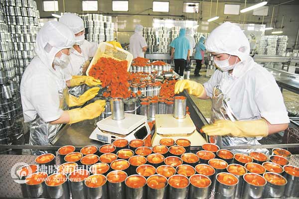 碭山縣興達食品有限公司工人正在加緊生產黃桃罐頭,趕制訂單。