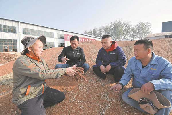 來自山東的技術人員李中武(左)給社員講解如何做好高粱后期管理。
