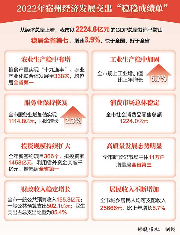 2022年,全市GDP總量穩居全省第七,增速3.9%;主要經濟指標穩中向好,保持“快于全國、好于全省”的良好態勢,經濟高質量發展取得實質性進展……亮眼的成績背后,展示出宿州經濟的蓬勃態勢和增長潛力。