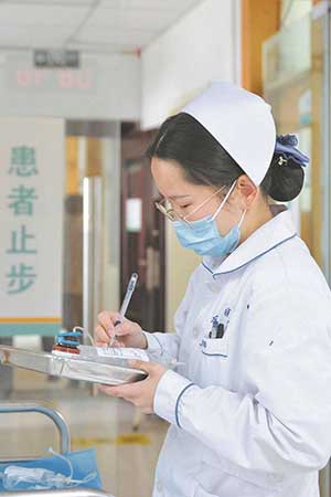 “××床下肢栓塞,交班護士要交代家人不要拍打下肢……”早上7點半,市立醫(yī)院南區(qū)感染科進行早交班。夜班醫(yī)護值班人員對病區(qū)患者病情進行交接,護士長劉湘云對護理交班內(nèi)容進行點評及重點工作提醒,護士們認真記錄。科主任總結(jié)并交代注意事項。會后,大家各司其職,抽血、配藥、輸液……開始了一天忙碌的工作。