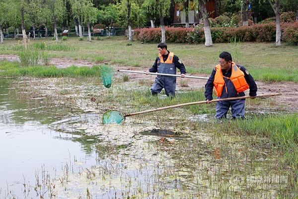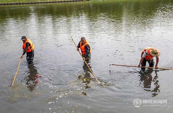 清晨6點,兩人就到達地點,麻利地穿上皮衩,帶著撈罩下湖打撈水面垃圾、綠苔及雜草等漂浮物。他們從三角洲公園南長廊沿湖堤一直行至西北土山,然后進入湖中3個島區,環島入水打撈垃圾雜草等水上漂浮物。環湖堤長達6公里以上,每天站在1米多深的水中,一干就是三四個小時。