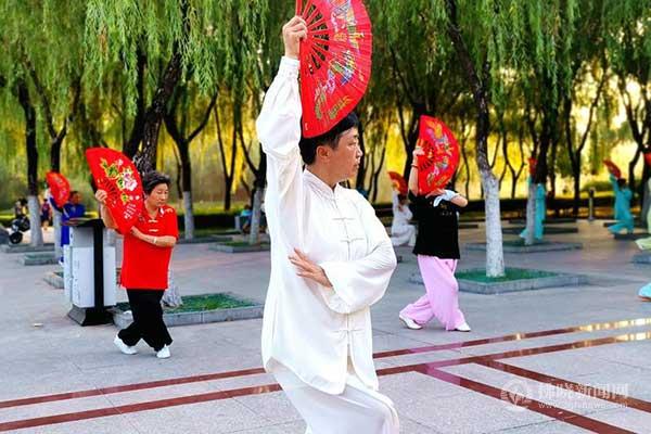 市民在宿城沱河公園表演太極扇。 本報(bào)通訊員 攝