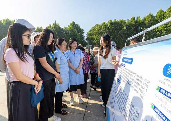 9月6日上午,在宿城銀河廣場(chǎng),市醫(yī)保局工作人員向市民宣傳“國(guó)家集采藥品進(jìn)藥店”醫(yī)保政策。