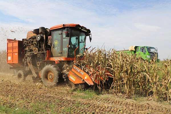 資料圖片:大型機械正在埇橋區西二鋪鎮收獲玉米。特約攝影 張成伍