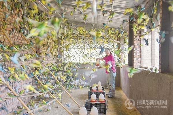 7月12日的早晨,尋著啁啁喳喳的鳥叫聲,筆者走進“巾幗致富能手”榮梅英的鸚鵡棚。此時,榮梅英正在檢查鸚鵡的食、水供應情況。色彩斑斕的鸚鵡翩翩飛舞,一片歡騰。