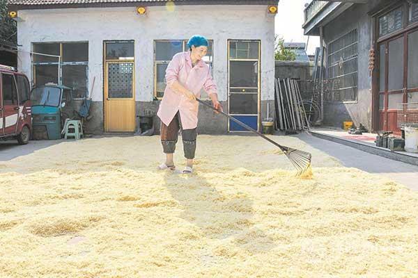 養(yǎng)殖戶在晾曬給小鳥抱窩用的軟木屑。