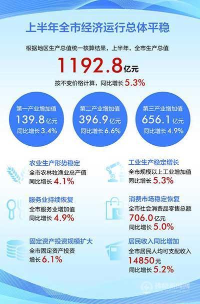 根據地區生產總值統一核算結果,上半年,全市生產總值1192.8億元,按不變價格計算,同比增長5.3%。分產業看,第一產業增加值139.8億元,同比增長3.4%;第二產業增加值396.9億元,同比增長6.6%;第三產業增加值656.1億元,同比增長4.9%。