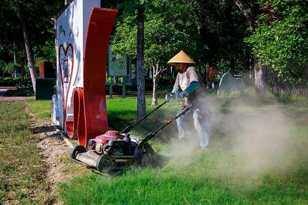 園林養(yǎng)護(hù)工在修剪草坪。