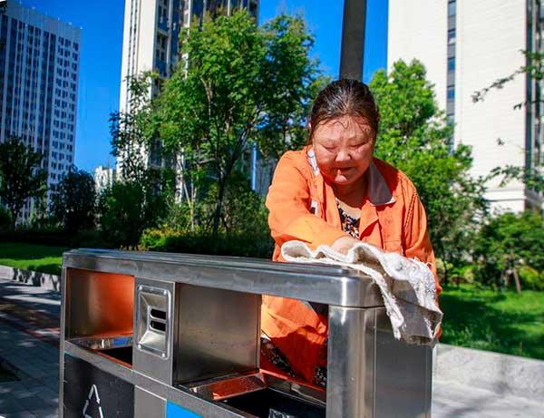 環(huán)衛(wèi)工在清理垃圾桶。