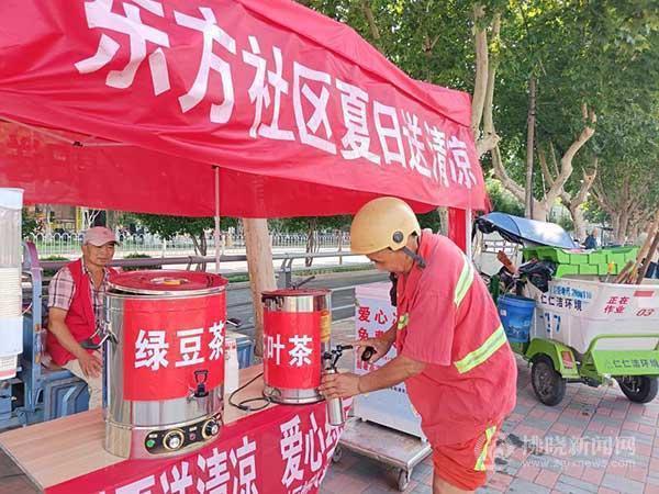 8月3日,在埇橋區(qū)道東街道東方社區(qū)的夏日送清涼驛站,一名環(huán)衛(wèi)工人在接茶水飲用??崾顣r節(jié),市、區(qū)部分機(jī)關(guān)單位、愛心企業(yè)、組織等紛紛行動起來,為環(huán)衛(wèi)工人、快遞員、交警等室外工作者免費(fèi)提供冷飲以及綠豆茶、茶葉茶等,讓市民清涼度夏。特約攝影 祝家剛