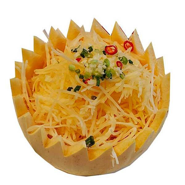 在泗縣玉蘭公寓附近的一家創意美食餐廳內,餐館負責人劉敏女士向記者介紹,涼拌絞瓜絲的制作非常簡單,卻又充滿了巧思。首先,將絞瓜洗凈,切成兩半,用勺子挖出瓜瓤,然后,將絞瓜放入鍋中蒸熟,待冷卻后用筷子輕輕攪拌,絞瓜絲便自然地從瓜中分離出來。接著,將絞瓜絲放入碗中,加入適量的鹽、糖、醋、蒜末、辣椒油、香油等調料,攪拌均勻即可。