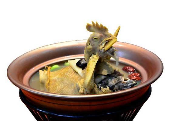 此菜選用3年以上老母雞和甲魚,將其放入大砂煲中,加入竹筍、紅棗、中草藥等佐料,文火慢燉約6個(gè)小時(shí),長(zhǎng)時(shí)間的燉制讓雞肉變得酥軟,而甲魚肉依然緊實(shí)鮮嫩。甲魚富含蛋白質(zhì)、維生素等多種營(yíng)養(yǎng)成分。雞肉蛋白質(zhì)含量較高,易被人體吸收利用,有增強(qiáng)體力、強(qiáng)壯身體的作用。不過(guò)這道菜主要品嘗的并不是肉而是湯,野生甲魚的鮮完美地與老母雞的香交融在一起,讓人欲罷不能!
