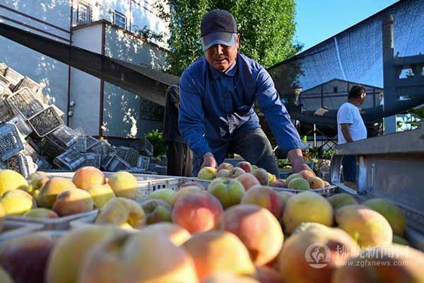 工人在鮮桃收購(gòu)點(diǎn)搬運(yùn)桃子。