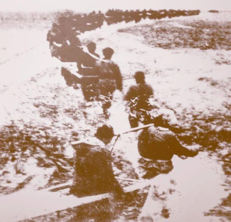 在淮海戰(zhàn)役第三階段,連降雨雪,天寒地凍,車輛難行,為及時(shí)把碭山車站積壓的物資轉(zhuǎn)運(yùn)到前線,中共碭南縣委書(shū)記魯禹道扛起面袋,踏著積雪走在前面,黨員干部緊隨其后,組成1.58萬(wàn)人的隊(duì)伍,擔(dān)挑肩扛將1430萬(wàn)斤米面送到前線。