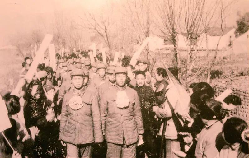 解放區(qū)群眾夾道歡送優(yōu)秀子弟光榮參軍。