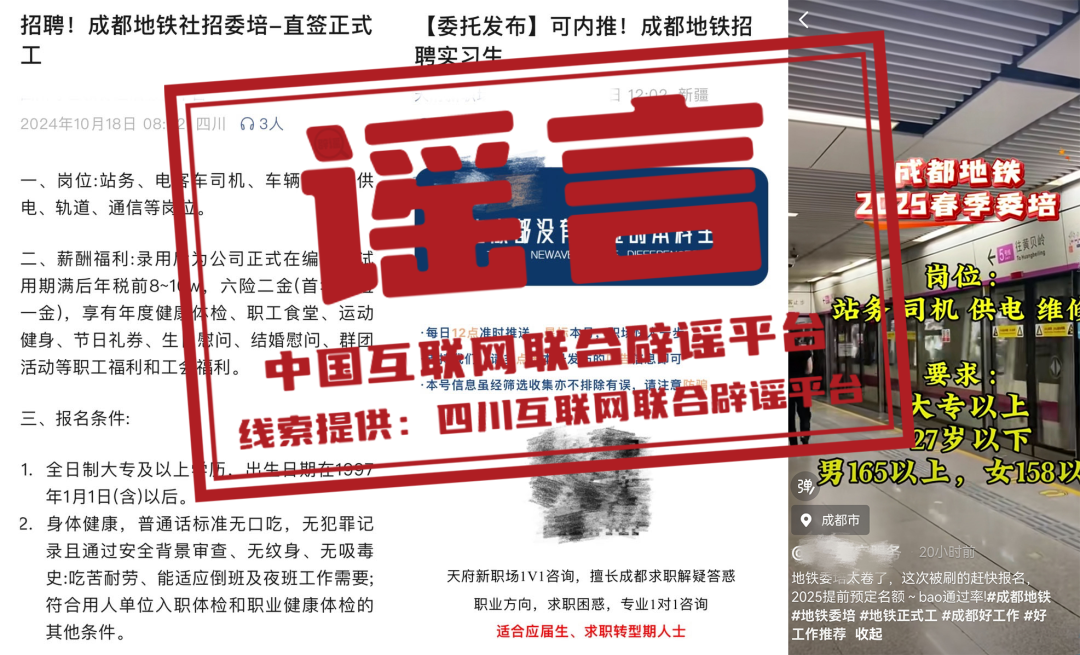 真相:近日,部分網絡平臺陸續出現所謂“成都地鐵內推、直簽、提前預定名額、包通過率”“濟南地鐵校園招聘有‘真題’、在線筆試一把過”等信息,引發關注。對此,成都軌道集團、濟南軌道交通集團均回應稱,從未授權或委托任何中介、個人或培訓機構等第三方組織任何形式的招聘考試輔導或培訓,也未向任何第三方提供所謂的“真題”或“題庫”,且在招聘過程中不存在收取任何形式的報名費、中介費、手續費等或要求應聘者繳納任何形式的押金、保證金、活動費等行為。所有以“直簽”“內推”“預定名額”“保通過率”為噱頭發布的信息均為虛假信息。請廣大應聘者、考生及市民朋友注意甄別,謹防受騙。(來源:四川互聯網舉報辟謠平臺、山東互聯網聯合辟謠平臺、成都網絡辟謠、濟南互聯網聯合辟謠平臺)