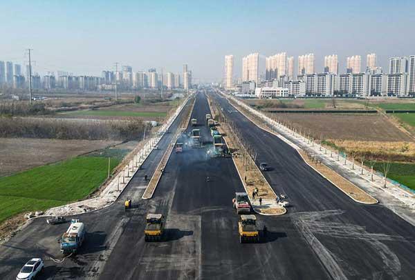 宿城銀河一路東延工程韓池子路以東路段在進(jìn)行瀝青鋪設(shè)作業(yè)。
