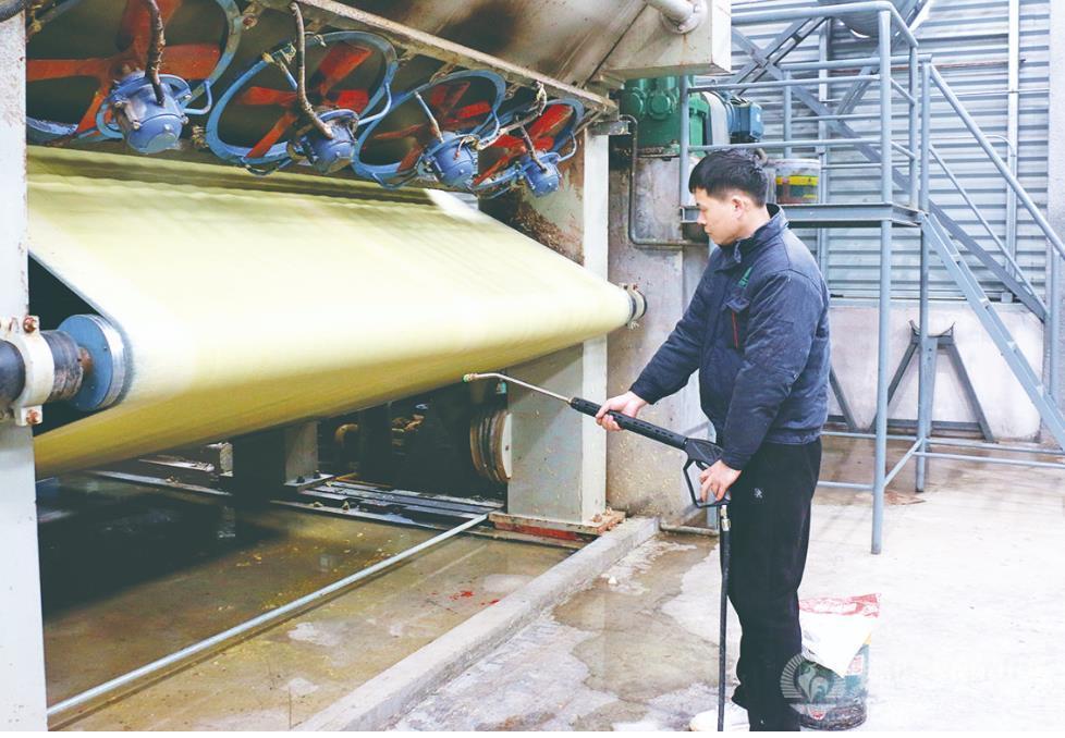 宿州中農秸美科技有限公司纖維干燥車間內,工人正在沖洗紙機毛布。