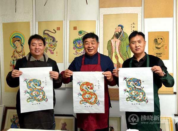 “碭山年畫(huà)”省級(jí)非遺代表性傳承人黃興橋(中)創(chuàng)作的蛇年年畫(huà)。