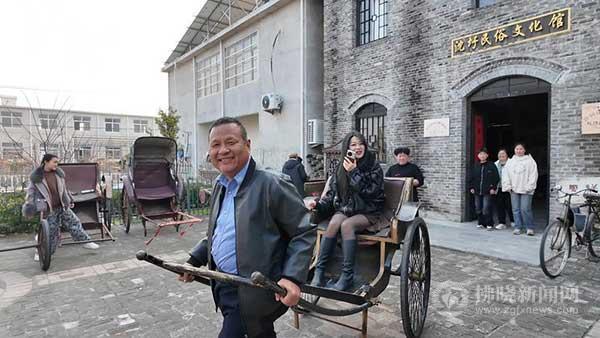 游客中很多是沖著村里一座收藏著上萬件“老物件”的民間民俗文化館來的。在民俗文化館,記者看到有游客興致勃勃地拉著黃包車,笑聲不斷,有游客坐上花轎,同伴打趣地吆喝一聲“起轎咯”,也有游客在老式農具處給身邊的孩子講解它們的用途。