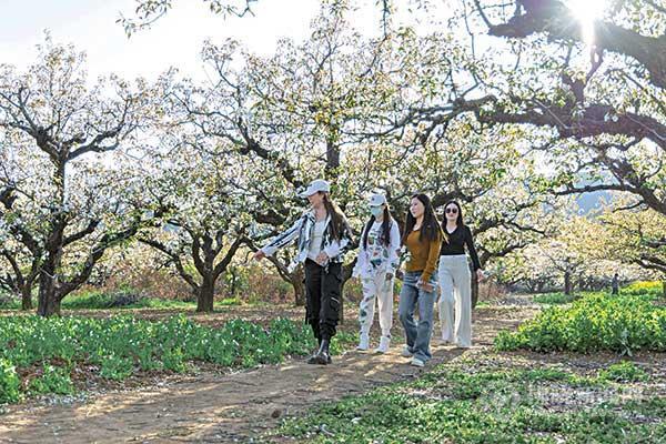 水庫邊的梨花正當時節,一樹樹雪白映著碧水,恰是“青旗沽酒趁梨花”的意境。帳篷點綴在梨園之間,為這幅春日畫卷添了幾分現代趣味。遠處山坡上,新綠的草色如裙裾斜曳,正是“草綠裙腰一道斜”的絕妙寫照。