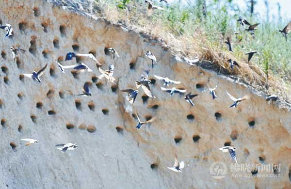 拂曉新聞網--拂曉報訊(文/記者 路楊 圖/特約攝影 崔猛)前不久,近萬只被列入“三有”保護名錄的崖沙燕在碭山縣黃河故道園藝場段的河堤上筑巢育雛。密密麻麻的巢穴布滿河堤,成群的崖沙燕在空中盤旋飛舞,時而輕點水面,時而穿梭于巢穴之間,為這片古老的土地增添了靈動之美。隨著崖沙燕在此安家的消息傳開,碭山縣黃河故道成為了網紅打卡地,吸引了眾多游客和攝影愛好者前來觀賞、拍攝。