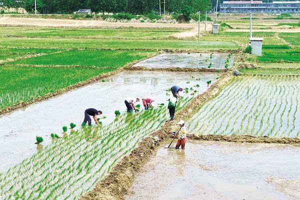 埇橋區夾溝鎮鎮頭村農民正在進行香稻插秧。特約攝影 丁輝