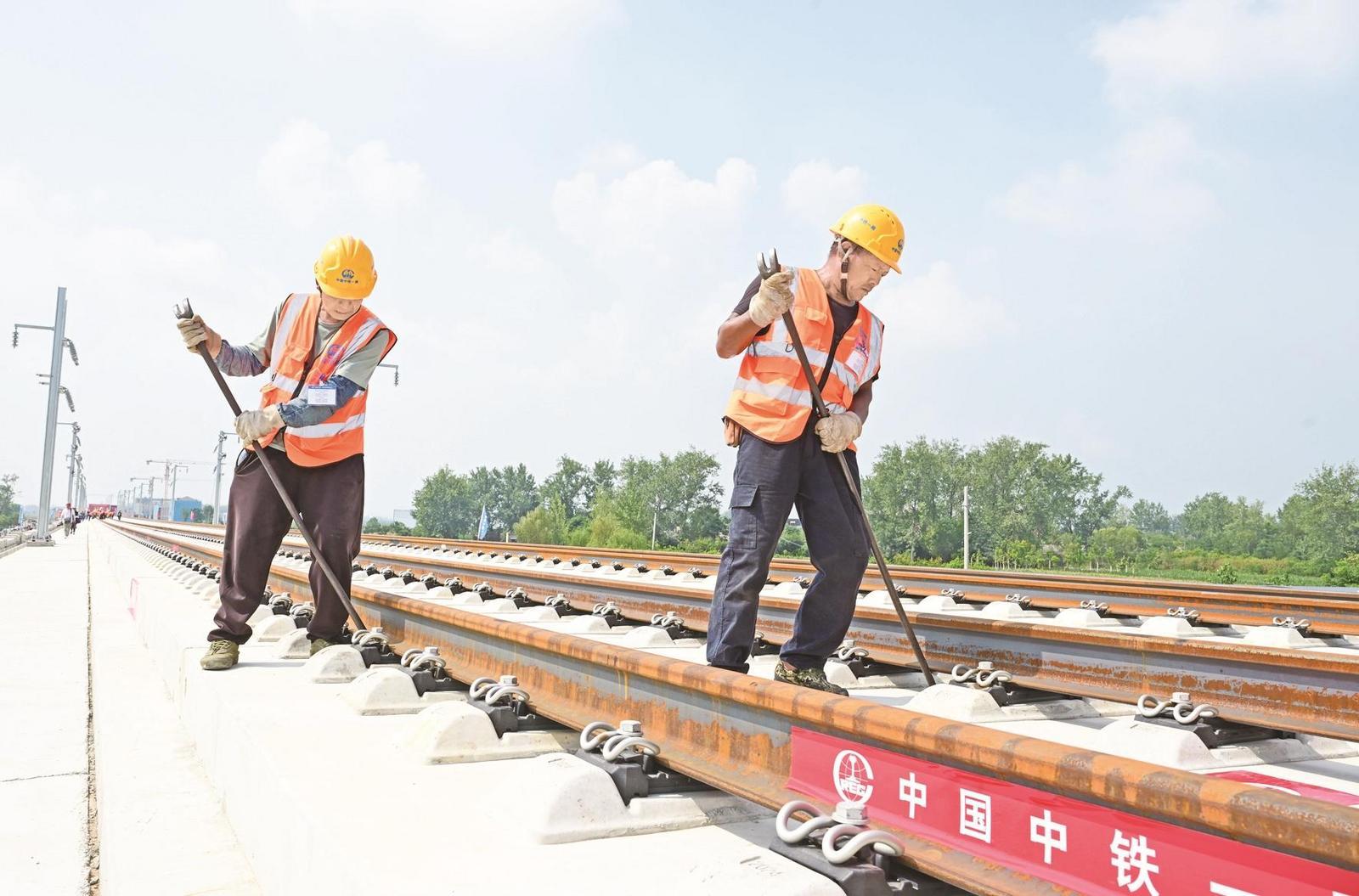 中鐵一局施工人員在淮宿蚌城際鐵路鋪軌施工現(xiàn)場(chǎng)作業(yè)。 新華社記者 周牧 攝
