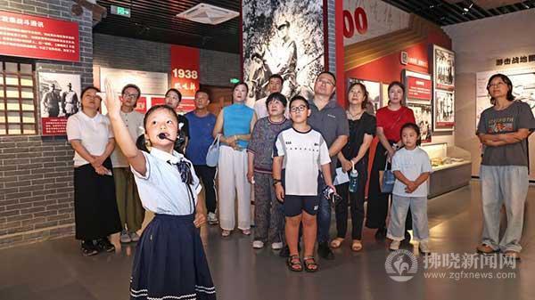 “彭雪楓將軍被毛澤東、朱德譽(yù)為‘共產(chǎn)黨人的好榜樣’。在左側(cè)墻面上方,紅色雕刻字‘將軍殉國,澤被長淮’,是對(duì)他光輝一生的高度概括……”9歲小講解員錢沐晨站在展板前,胸前的紅領(lǐng)巾格外鮮艷。他的聲音時(shí)而激昂,時(shí)而低沉,將彭雪楓將軍光榮而偉大的革命生涯娓娓道來。講到動(dòng)情處,他聲音微微顫抖,眼中泛起晶瑩的淚光,在場觀眾無不為之動(dòng)容。