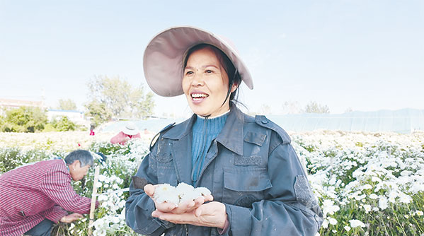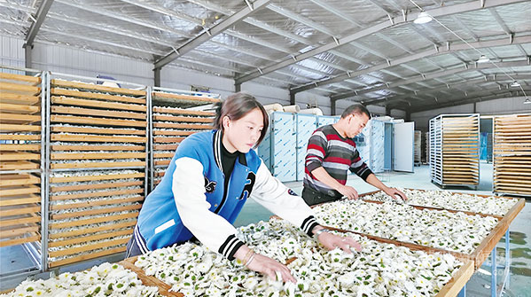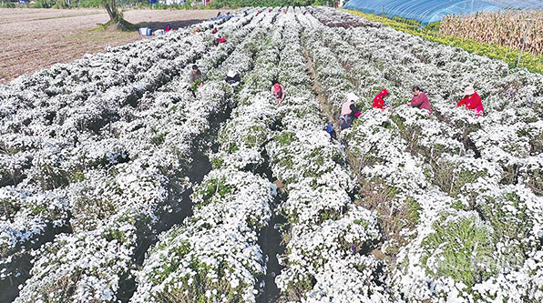 七月菊的采收期雖然只有十多天,卻帶動了整個村莊的生產節奏:清晨,30多名采花人同時在花田作業;中午,運輸車隊在田間和車間往返穿梭;下午,加工車間里機器轟鳴不停;傍晚,包裝好的干花被裝入冷鏈車發往全國各地。
