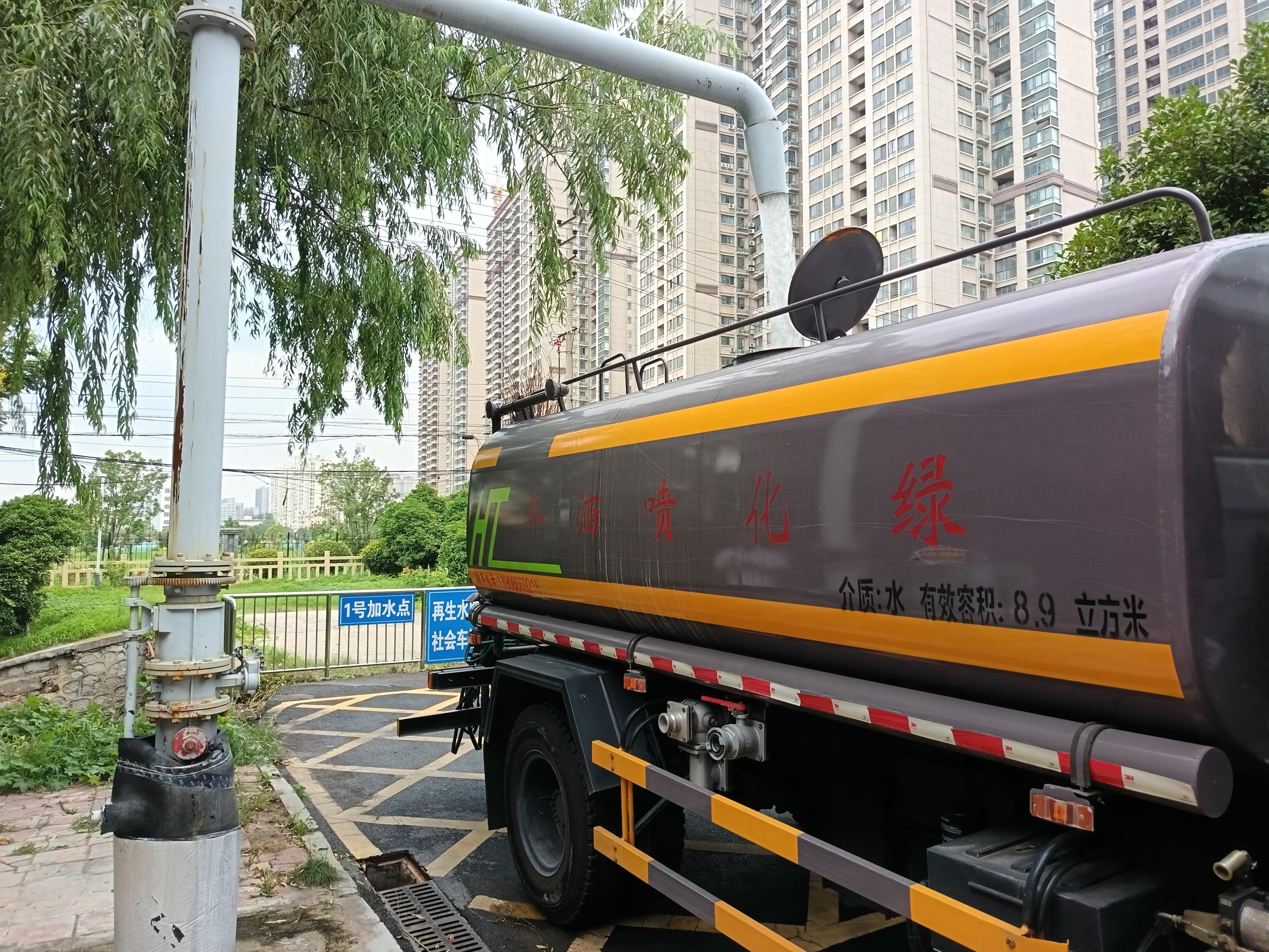 將設有取水口的水鶴與噴灑車對接好或將水帶與環衛車連接好,再生水便緩緩流進了噴灑車、環衛車的水箱……隨著一輛輛車從再生水取水點駛出,應用至市政綠化澆灑、道路沖洗除塵的場景,已成為淮北街頭“一景”。