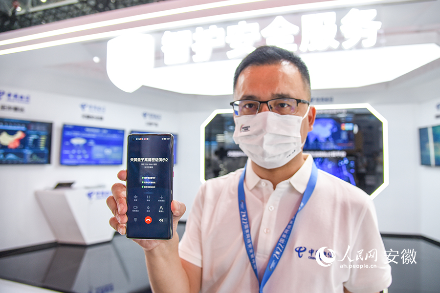 工作人員展示天翼量子高清密話。人民網 李希蒙攝