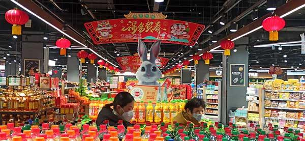 宿城華夏世貿超市張燈結彩,開設了“福兔賀春”年貨大街。 特約攝影 王玉明