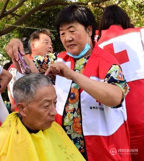 “大姐,您來啦!稍等一會兒,我給這位同志理好后就給您剪。”近日,在宿城東仙橋公園的小廣場,志愿者陳玲笑著對一位老人說。