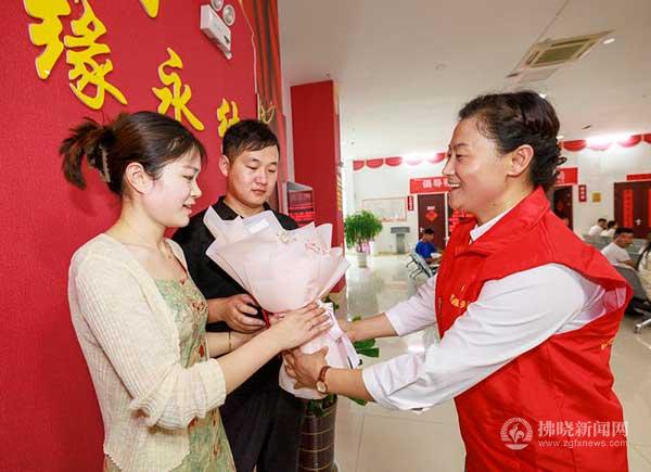 8月22日,埇橋區民政局婚姻登記處工作人員為新人送上鮮花和祝福。 記者 蘇洋 攝