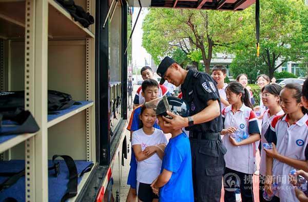 走進裝備室,無人機、防暴服……平時難得一見的武器裝備一一亮相,特警細致地向孩子們介紹各種裝備的名稱性能,有的同學還穿上厚重的防暴服,過了一把“警察癮”。