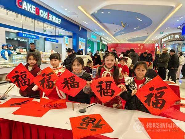 1月19日,小朋友們在宿城吾悅廣場為市民書寫“福”字。