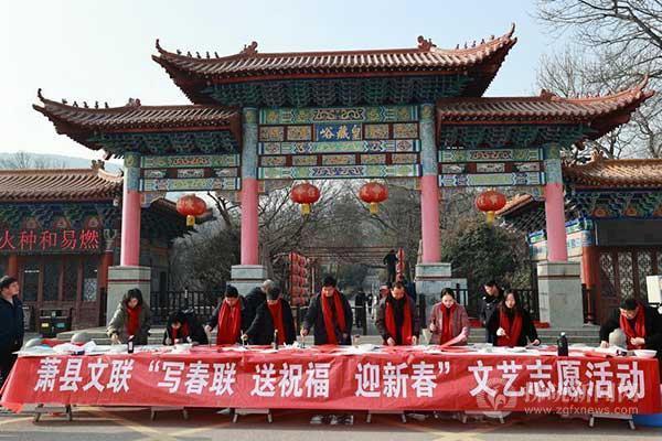 日前,由蕭縣文聯組織開展的“寫春聯 送祝福 迎新春”文藝志愿活動在皇藏峪風景區舉行。活動邀請蕭縣書法家協會參與,書法愛好者揮毫潑墨,書寫寓意吉祥的春聯和“福”字,讓群眾在書香墨韻中提前感受年味。王子晗 攝
