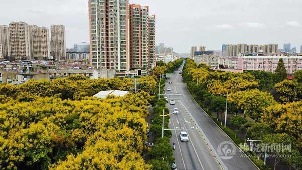 金秋時節,宿城一些主干道兩旁的欒樹進入盛花期,金黃色的花朵一簇簇、一串串,隨風搖曳、美不勝收,給美麗的秋日增添了一份詩意。特約攝影 張成伍